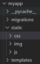 위와 같이 myapp 폴더 아래에 static 폴더를 만들고, css, img, js 폴더를 만든다.